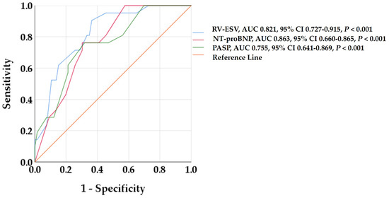 In the ROC analysis, RV-ESV, NT-proBNP, and PASP showed the best predictive value for RV reverse remodeling (Figure 2). Optimized cut-off values of 41.5 mL/m2 for RV-ESV, 2490 pg/mL for NT-proBNP, and 41 mmHg for PASP were identified as predictive of RV reverse remodeling.