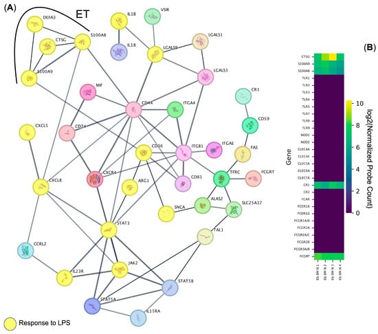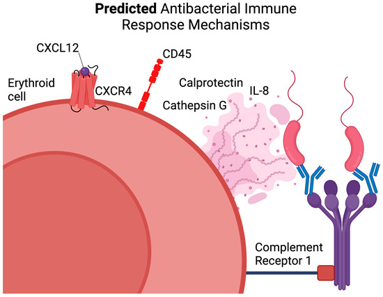 In this work, in order to systematically assess the human bone marrow Erythroid-cell immunome, we performed a protein–protein interaction network analysis using publicly available data via Cytoscape and STRING. We found the presence of a functional network of protein–protein interactions that were included in the “Response to lipopolysaccharide” Gene Ontology Biological Process Term (Figure 1A, Table 1). In addition, we found a subnetwork of the aforementioned network that contained genes responsible for the formation of extracellular neutrophil traps—Calprotectin (S100A8, S100A9), Cathepsin G (CTSG gene), and Alpha-3 defensin (DEFA3 gene), and thus for directly combating bacteria. We also identified other direct regulators of antibacterial inflammatory response, such as IL-1b, IL-8, and IL-18 cytokines and chemokines (Figure 1A).