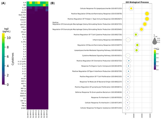 Cytokine secretion analysis of human bone marrow Erythroid-cell-conditioned media via Bio-Plex. (A) Heatmap of cytokines secreted by normal human bone marrow Erythroid cells (Eb BM N). The heatmap displays log2-transformed values of cytokine concentrations in pg/mL, where yellow indicates the highest detected secretion levels and deep purple represents the absence of cytokine secretion. (B) Gene Ontology Biological Process overrepresentation analysis of the cytokines detected in human adult bone marrow Erythroid cells. The yellow color corresponds to the lowest q-value, while deep purple represents the highest q-value. The size of each bubble reflects the percentage of detected proteins included in the Gene Ontology Biological Process analysis relative to the full set in the database.