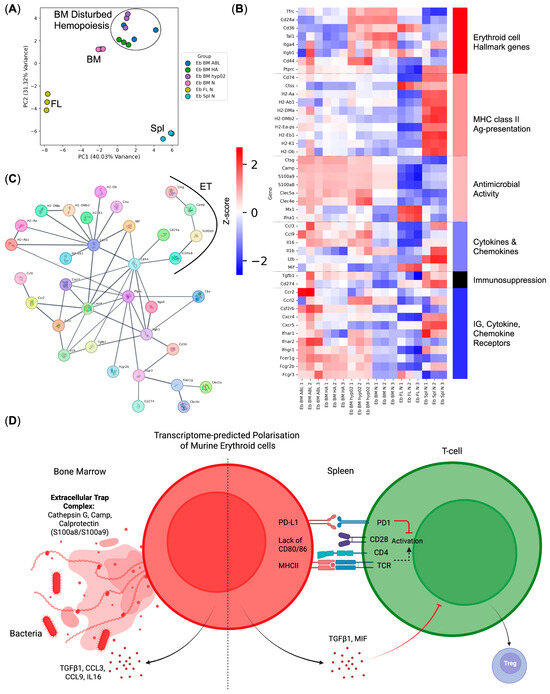 Integrative analysis of murine Erythroid-cell immunome. (A) PCA plot of the samples, BM—bone marrow, Spl—spleen, and FL—fetal liver; (B) heat map of the murine Erythroid-cell immune transcriptome genes; (C) protein–protein interaction network of the Erythroid-cell immune transcriptome protein-coding genes (extracellular trap (ET) complex genes are depicted as bubbles with their protein structure inside and are highlighted via a black arc); (D) transcriptome-predicted polarization of murine bone marrow and spleen Erythroid cells—bone marrow murine Erythroid cells express genes involved in antibacterial immunity, while splenic murine Erythroid cells express genes involved in the exogenous antigen presentation via MHC class II.