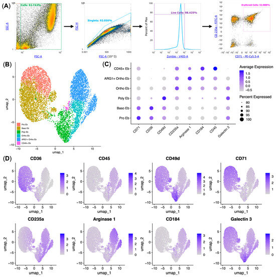 Erythropoiesis is a multistep process that begins with pluripotent stem cells and ends with the formation of mature erythrocytes devoid of nuclei [1]. The primary function of erythrocytes is oxygen transport, but immature, nucleus-containing Erythroid cells are also capable of performing other functions, including participation in regulating immune responses [2,3]. Erythroid cells make up a continuum of differentiation called the erythron, which includes: proerythroblasts (Pro Eb), basophilic erythroblasts (Baso Eb), polychromatophilic erythroblasts (Poly Eb), and orthochromatophilic erythroblasts (Ortho Eb) [4,5]. Erythroid cells, being immature cells, are usually absent or very rare in the peripheral blood of healthy adults. Still, they are present in large numbers in cord blood [6,7] and fetal liver [8,9] during human intrauterine development. Erythroid cells can be identified by the presence of surface markers such as CD71 (TFRC gene), the transferrin receptor [10], and CD235A (GYPA gene), glycophorin A, a major sialoglycoprotein of the Erythroid-cell membrane that is unique to Erythroid cells [11,12]. In addition, Erythroid cells express other surface markers, such as CD36 and CD49d (ITGA4 gene). The expression of the aforementioned markers decreases with the differentiation of Erythroid cells into mature erythrocytes [9,13,14].
