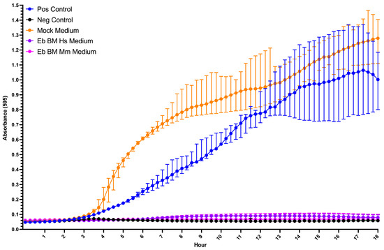 In vitro bacterial growth inhibition assay: positive (Pos) control—E. coli in LBB, negative (Neg) control—E. coli in LBB with kanamycin, mock medium—E. coli in X-VIVO 10 medium 1:4 LBB, Eb BM Hs medium—E. coli in human bone marrow Erythroid-cell-conditional medium 1:4 LBB, and Eb BM Mm medium—E. coli in mouse bone marrow Erythroid-cell-conditional medium 1:4 LBB (n = 6).