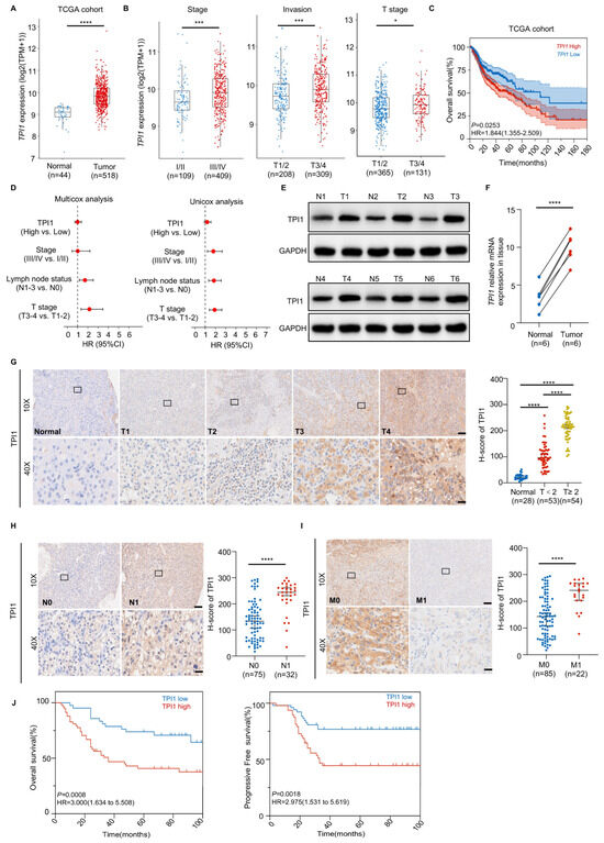 High TPI1 expression is associated with poor prognosis in oral cancer patients. (A) TPI1 mRNA expression levels in oral cancer vs. adjacent non-tumor tissues were analyzed using TCGA datasets. (B) TPI1 expression stratified by clinical stage, invasion depth, and histological grade in TCGA cohort. (C) Kaplan–Meier survival curves for overall survival (OS) based on high vs. low TPI1 expression (TCGA cohort). (D) Univariate and multivariate Cox regression analyses assessing TPI1 and clinical features as predictors of OS. (E,F) Western blot (E) and RT-qPCR (F) analyses of TPI1 in six paired clinical oral tumors and adjacent tissues. (G–I) Immunohistochemical (IHC) analysis of TPI1 in 107 oral cancer samples across T (G), N (H), and M (I) stages. (J) Kaplan–Meier plots comparing OS and progression-free survival (PFS) between high vs. low TPI1 expression groups. Scale bars: 500 μm (overview images) and 50 μm (magnified fields). Data are presented as mean ± standard deviation (SD). Statistical comparisons between two groups were performed using an unpaired two-tailed Student’s t-test. For survival analyses, the log-rank (Mantel–Cox) test was used; p < 0.05 (*), p < 0.01 (**), p < 0.001 (***), p < 0.0001 (****). The number of biological replicates (n) for each experiment is indicated in the corresponding figure’s panels or legends.