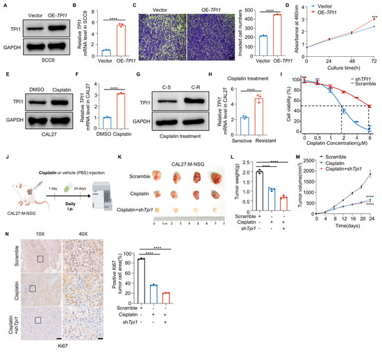 We overexpressed TPI1 in SCC9 cells to demonstrate its role. Western blot and RT-qPCR confirmed TPI1 overexpression in oral cancer (Figure 3A,B). This upregulation significantly enhanced the proliferation and migration of ccRCC cells (Figure 3C,D), indicating that TPI1 promotes oral cancer progression. Cisplatin exposure upregulated TPI1 expression in CAL27 cells (Figure 3E,F), and cisplatin-resistant cells displayed elevated TPI1 levels even under moderate drug stimulation (Figure 3G,H). An IC50 assay indicated that TPI1 knockdown enhanced cisplatin efficacy (Figure 3I). In an in vivo tumor model, the cisplatin injection demonstrated that TPI1 inhibition improved treatment outcomes, reducing tumor weight and volume (Figure 3K–M). Ki67 IHC staining revealed that TPI1 knockdown combined with cisplatin most effectively inhibited tumor growth (Figure 3N). Taken together, we identified TPI1’s role in promoting oral cancer and aiding cisplatin resistance.