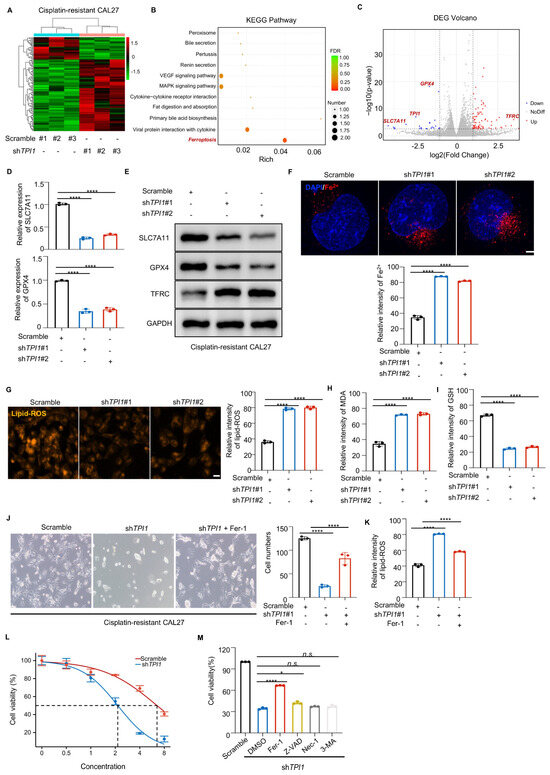 TPI1 silencing induces ferroptosis in oral cancer cells in vitro. (A) RNA-Seq of TPI1-knockdown CAL27 cells revealed ferroptosis as a significantly enriched pathway. (B) KEGG pathway enrichment analysis based on differentially expressed genes. (C) Volcano plot of gene expression changes upon TPI1 knockdown. (D,E) RT-qPCR (D) and Western blot (E) analysis of SLC7A11, GPX4, and TFRC following TPI1 silencing. (F–I) Biochemical assays of ferroptosis markers: intracellular Fe2+ (F), lipid ROS (Scale bar: 400 nm) (G), malondialdehyde (MDA) (Scale bar: 20 μm) (H), and glutathione (GSH) levels (I) in CAL27 cells. (J) Bright-field images showing cell morphology in the Scramble control, shTPI1, and shTPI1 + Fer-1-treated CAL27 cells. (K) Quantification of lipid-ROS in cells treated as in (J), with Fer-1 significantly reducing lipid peroxidation in TPI1-depleted cells. (L) IC50 dose-response curves comparing erastin sensitivity in Scramble and shTPI1-transfected CAL27 cells. TPI1 knockdown notably enhances erastin sensitivity. (M) Rescue experiment assessing the effects of cell death inhibitors on TPI1-knockdown cells. Among ferroptosis (Fer-1, 2 μM), apoptosis (Z-VAD-FMK, 20 μM), necroptosis (Nec-1, 20 μM), and autophagy (3-MA, 5 mM) inhibitors, only Fer-1 significantly restored cell viability. Values represent mean ± SD. Data are presented as mean ± standard deviation (SD). Statistical comparisons between two groups were performed using an unpaired two-tailed Student’s t-test. p < 0.05 (*), p < 0.01 (**), p < 0.001 (***), p < 0.0001 (****). The number of biological replicates (n) for each experiment is indicated in the corresponding figure’s panels or legends.