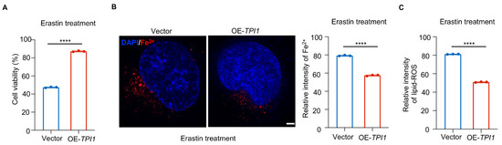 To further validate the role of TPI1 as a suppressor of ferroptosis, we examined whether TPI1 overexpression could counteract ferroptosis induction. Cisplatin-resistant CAL27 cells were transfected with a TPI1-overexpressing construct and subsequently treated with 5 μM erastin. Cell viability assays demonstrated that TPI1-overexpressing cells exhibited significantly higher survival rates compared with vector control cells under erastin treatment (Figure 5A), indicating enhanced resistance to ferroptosis. Further biochemical assays confirmed that TPI1 overexpression significantly reduced intracellular ferrous iron (Fe2+) levels (Figure 5B) and markedly decreased lipid reactive oxygen species (lipid-ROS) accumulation following erastin exposure (Figure 5C). These data suggest that TPI1 overexpression inhibits ferroptosis by restricting iron availability and suppressing lipid peroxidation.