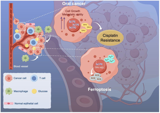 Taken together, these findings support the conclusion that elevated TPI1 expression enables cisplatin-resistant oral cancer cells to escape ferroptotic cell death. By maintaining redox balance and limiting ferroptosis-associated stress, TPI1 contributes to therapy resistance. Therefore, targeting TPI1 may represent a promising therapeutic strategy to restore ferroptotic vulnerability and overcome chemoresistance in oral cancer (Figure 6).