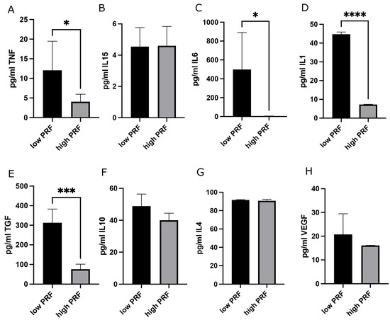 Evaluation of the PMN-related cytokine profile in high- and low-RCF PRF in supernatants via the ELISA. The data show the absolute concentrations of TNFα (A), IL15 (B), IL6 (C), IL1 (D), TGFβ (E), IL10 (F), IL4 (G), and VEGF (H) in pg/mL. * p-value < 0.05, *** p-value < 0.001, and **** p-value < 0.0001.