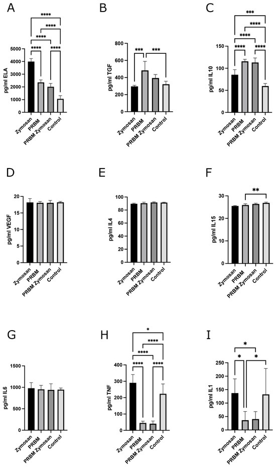 Evaluation of cytokines related to proinflammatory and regenerative phenotypes of PMNs after low-RCF PRF/PRBM combination for 4 h. The data show the absolute concentrations of ELA (A), TGFβ (B), IL10 (C), VEGF (D), IL4 (E), IL15 (F), IL6 (G), TNFα (H), and IL1 (I) in the appropriate experimental groups (PRF + Zymosan, PRF + PRBM, PRF + PRBM + Zymosan and low-RCF PRF control; six donors PRF, n = 6). * p-value < 0.05, ** p-value < 0.01, *** p-value < 0.001, and **** p-value < 0. 0001.