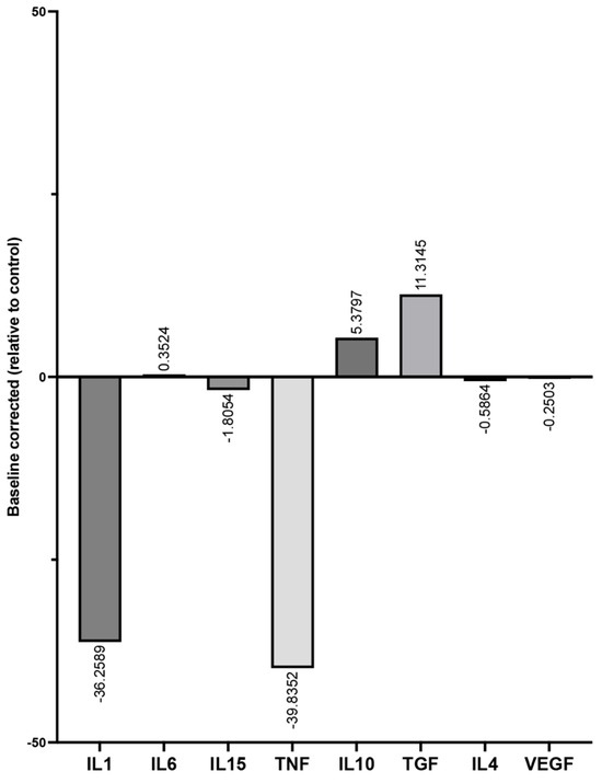 The baseline corrected cytokine profile in Figure 4 provides an overview of the PMN cytokine level in the PRF/PRBM combination compared to control low-RCF PRF alone (relative concentration to control = 100%; baseline = 0). The graph highlights the PRBM-mediated upregulation of cytokines related to the regenerative phenotype of PMNs, namely, IL10 and TGFß, and the downregulation of the proinflammatory PMN-derived cytokines IL1 and TNFα in response to combining the PRBM with low-RCF PRF compared to the control low-RCF PRF (zero).