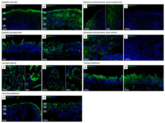 Immunofluorescence of human laryngeal tissues. Epiglottis oral side (A,B): stratum superficiale (“sup”), intermediale (“int”), and basale (“b”) can be distinguished, SP-G reactivity was found mainly in the superficial cell layer. PLUNC reactivity was found in all cells; epiglottis laryngeal side (C,D): SP-G reactivity at apical poles of the ciliated cells (arrow). Signal for PLUNC predominantly in the basal cells (asterisks), but also in the ciliated cells; vestibular fold glands (E,F): reactivity for SP-G and PLUNC antibody in the acinar cells, for PLUNC predominantly at the apical poles. Arrow shows secretion of SP-G into the lumen; vocal fold epithelium (G,H); strong signal for SP-G in stratum superficiale (“sup”), faint signal in stratum intermedium (“int”), almost no signal in stratum basale. PLUNC reactivity with similar intensity across all epithelial cells; squamous cell carcinoma (SCC) of the vocal fold ((I,J): tumor invasion front, (K,L): tumor stroma): the cancer cells of the tumor invasion front (asterisk in I) and tumor stroma (K) show strong reactivity for the SP-G-antibody. No signal for PLUNC; tracheal epithelium (M,N): signal for SP-G only in the ciliated cells. PLUNC reactivity in basal and ciliated cells. (SP-G/PLUNC: green; DAPI (4′,6-diamidino-2-phenylindole) = blue).