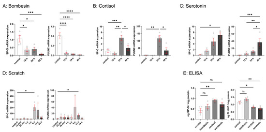 Stimulation of FaDu cells for 12, 24, and 48 h after treatment with 10 µM bombesin (A), cortisol (B), and serotonin (C). While stimulation with bombesin led to a significant decrease in SP-G and PLUNC mRNA, a significant increase was seen after stimulation with cortisol and serotonin. After 48 h of stimulation with cortisol, the gene expression of SP-G and PLUNC decreased again. (D): Simulation of wound healing of FaDu cells for 15 min, 30 min, 1 h, 3 h, 6 h, 12 h, and 24 h after mechanical scratching. Scratching led to a significant increase in SP-G and PLUNC mRNA after 6h and 12 h, respectively. Both mRNA decreased again after 24 h (E): stimulation of FaDu cells for 24 h after treatment with 10 µM bombesin, cortisol, and serotonin. A significant increase in cortisol was seen after stimulation with cortisol, and a significantly lower PLUNC concentration was seen after stimulation with cortisol and serotonin. SP-G and PLUNC mRNA expression of FaDu cells after stimulation was determined by qRT-PCR. SP-G and PLUNC proteins were quantified using ELISA. mRNA expression levels and protein concentration are expressed as mean ± SEM (n = 4). Significance value was defined at * p < 0.05, ** p < 0.01, *** p < 0.001, or **** p < 0.0001 and “ns = not significant” for p > 0.05.