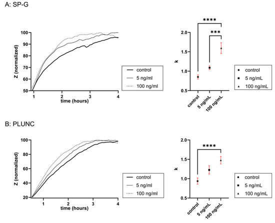 For wound healing experiments, the ECIS System from Applied Biophysics Inc. (Troy, NY, USA) with suitable 8-well cell culture slides with one electrode each well and a maximum volume of 400 µL (8W1E, Ibidi GmbH, Gräfelfing, Germany) was used. Cells (120 × 103) were seeded in each well of the 8W1E-slides and cultured as a monolayer until confluence. Cells were washed with phosphate-buffered saline (PBS) and changed to serum-free medium for 2 h. Then, cells were either treated with PLUNC (5 ng/mL, 100 ng/mL) or SP-G (5 ng/mL, 100 ng/mL), both from BIOZOL Diagnostica Vertrieb GmbH, Eching, Germany. After incubation for 1 h, a wound is created in each well by applying an AC current (30 s; 1600 µA; 60 kHz). After 24 h and 48 h, wounding is repeated. All experimental procedures were performed under normoxic conditions. Cell impedance was measured throughout the whole experiment at 4000 Hz. Then, the normalized impedances of the second and third woundings of each data set were combined into a mean impedance. The first wounding was excluded.