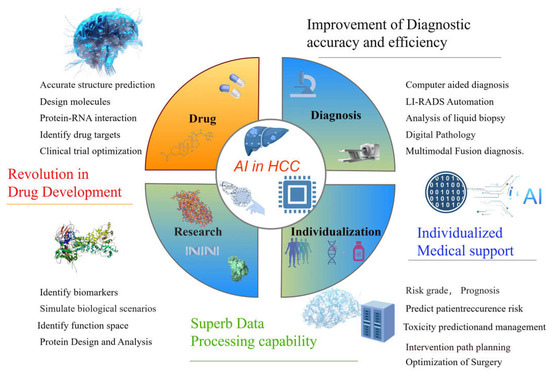 On 8 May 2024, AlphaFold 3 was published by Google DeepMind Technologies Limited, London UK. This model can be used in the accurate structure prediction of biomolecular interactions. Unlike earlier versions that required special treatment for different molecular types, AlphaFold 3’s framework aligns more closely with the fundamental physical principles governing molecular interactions. This makes the system significantly more efficient and reliable for studying novel molecular interactions [51,71,72]. AlphaFold 3’s sophisticated grasp of protein–ligand dynamics offers groundbreaking potential in the realm of drug discovery. Precisely pinpointing binding sites and determining the ideal configurations for drug candidates dramatically accelerates the drug design pipeline [73]. This capability is particularly transformative in the field of HCC research, where the rapid development of targeted therapies could yield treatments that are both more potent and less prone to adverse effects. Such advancements are reshaping therapeutic strategies and setting new benchmarks in precision medicine [74,75]. While challenges remain, such as the limited accuracy in predicting protein–RNA interactions, these hurdles are being addressed, paving the way for innovations in personalized medicine. AlphaFold still has many limitations, such as the restriction of static structure, the influence of chemical modification, and the impact of micro-environmental factors, including intracellular pH and ion concentration. The accuracy of functional prediction needs to be further improved [73]. Meanwhile, AI has cemented its role as a game-changer in drug development, revolutionizing the identification of new drug targets and repurposing of existing compounds, thereby opening new frontiers in medical research.