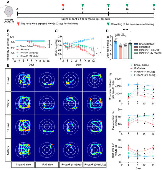 Supplementation with ceAF reduces IR-induced mortality and enhances the exercise capacity of mice following IR. (A) Schematic diagram of experiments. (B–D) ceAF effectively promoted the probability of survival (B), body weight (C), and daily food intake (D) in IR-treated mice. (E) Representative images of mouse movement track. (F) ceAF increased movement distance and exercise time per minute while it decreased resting time in IR-treated mice. n = 5 per group in (E,F). Data represent the mean ± SEM. * p < 0.05; **** p < 0.0001. # p < 0.05 vs. IR + saline. One-way ANOVA.