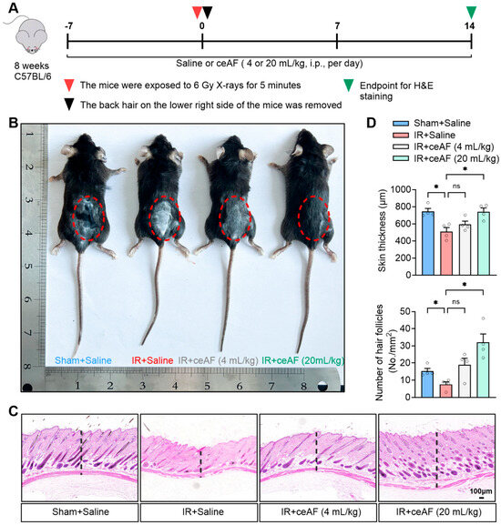 Supplementation with ceAF reverses IR-induced skin damage in mice. (A) Schematic diagram of experiments. (B) Representative images of mouse hair growth. (C) Representative images of H&E staining of skin tissues. (D) ceAF enhanced skin thickness and increased the number of hair follicles in IR-treated mice. n = 4 per group. Data represent the mean ± SEM. * p < 0.05. One-way ANOVA.