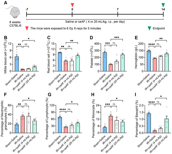 ceAF relieves IR-induced injury of the spleen hematopoietic system. (A) Schematic diagram of experiments. ceAF increased the major blood cell types, such as white blood cells (B), red blood cells (C), platelets (D), hemoglobin (E), lymphocytes (G), and basophil (I). Additionally, ceAF decreased neutrophils (F) and monocytes (H) in IR-treated mice. n = 6 per group. Data represent the mean ± SEM. * p < 0.05; ** p < 0.01; *** p < 0.001; **** p < 0.0001. One-way ANOVA.
