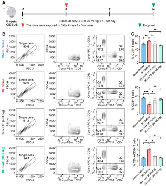 The spleen, being the largest peripheral immune organ, serves a critical role in the immune response [26]. Previous observations have demonstrated that IR leads to significant damage to the white pulp of the spleen, which is the primary site for specific immunity. These findings prompted further investigation into whether ceAF has a regulatory effect on immune function mediated by spleen lymphocytes in IR-treated mice. It has previously been indicated that the ratio of spleen CD4+/CD8+ T cells serves as a key indicator of immune regulation [27]. The present study used flow cytometry to analyze CD4+ T cells and CD8+ T cells and their ratio in the spleens of IR-treated mice administered either saline or ceAF (Figure 5A). The experimental findings revealed that IR resulted in an increase in CD4+ T cells, a decrease in CD8+ T cells, and a significant rise in the CD4+/CD8+ T-cell ratio in mice, indicating the severe impairment of spleen immune function. Notably, intervention with ceAF effectively reduced CD4+ T cells, increased CD8+ T cells, and normalized the CD4+/CD8+ T-cell ratio (Figure 5B,C). These results suggested that ceAF not only enhances the hematopoietic function of the spleen in IR-treated mice but also efficiently restores immune function.