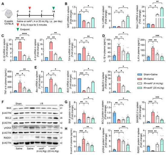 ceAF suppresses IR-induced oxidative stress and inflammation and enhances DNA repair after IR-induced damage to the spleen. (A) Schematic diagram of experiments. (B) ceAF upregulated the expression of antioxidant genes Nrf2, Ho-1, and Nqo-1 in IR-treated mouse spleen. (C) ceAF downregulated the expression of pro-inflammatory factors Il-1β, Il-6, and Tnf-α in IR-treated mouse spleen. (D) ceAF decreased the expression of pro-inflammatory factors IL-1β, IL-6, and TNF-α in IR-treated mouse plasma. (E) ceAF inhibited the expression of Bax while it promoted the expression of Bcl2 in IR-treated mouse spleen. (F) The expression of BAX, BCL2, γH2AX, and RAD51 in spleen detected by Western blot. (G) Statistical analysis of the expression of BAX and BCL2 from Western blot. (H) ceAF decreased the levels of 8-oxoG in IR-treated mouse plasma. (I) Statistical analysis of the expression of γH2AX and RAD51 from Western blot. n = 3 per group in (B,C,E). n = 8 per group in (D,G). n = 10 per group for detecting γH2AX protein. n = 8 per group for examining BAX, BCL2, and RAD51 protein. Data represent the mean ± SEM. * p < 0.05; ** p < 0.01; *** p < 0.001; **** p < 0.0001. One-way ANOVA.