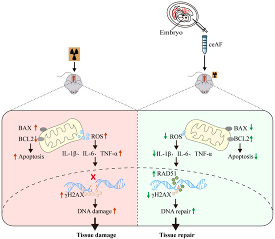The present study demonstrates that ceAF can effectively alleviate body damage induced by IR. This is evidenced by improvements in exercise capacity, reduced mortality rates, promotion of hair regeneration, restoration of internal organ structure and function, particularly the spleen, as well as decreased oxidative stress, inflammation, and DNA damage in the spleen (Figure 7). These findings offer novel insights and treatment approaches for mitigating IR-induced damage and are particularly relevant in addressing the growing concern of radioactive damage resulting from nuclear contamination.