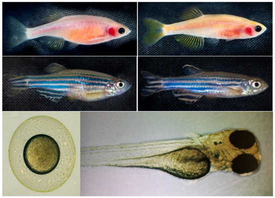- Choe, C.P.; Choi, S.-Y.; Kee, Y.; Kim, M.J.; Kim, S.-H.; Lee, Y.; Park, H.-C.; Ro, H. Transgenic fluorescent zebrafish lines that have revolutionized biomedical research. Lab. Anim. Res. 2021, 37, 26. [Google Scholar] [CrossRef]