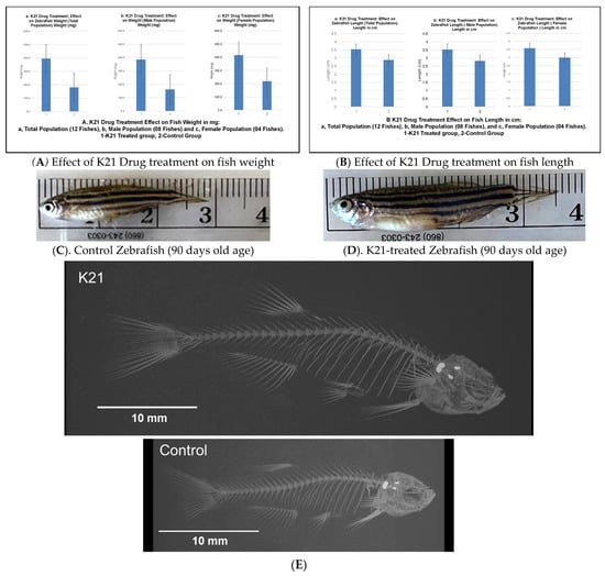 Figure 2A illustrates the impact of the K21 treatment on fish weight across the total population, as well as in male and female subpopulations. The K21-treated group exhibited a significant increase in mean weight compared to the control group, with statistical significance observed (p < 0.05). Male zebrafish in the K21-treated group showed a greater weight gain than their female counterparts.