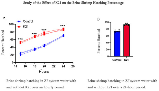Comparative study of the effect of K21 on the brine shrimp (Artemia sp.) hatching process. (A) Effect on brine shrimp hatching in control and K21-treated ZF system water at the 15, 18, 20 and 24 h stages. (B) Effect of K21 on the brine shrimp hatching process over a 24-h period. (*** p < 0.001).