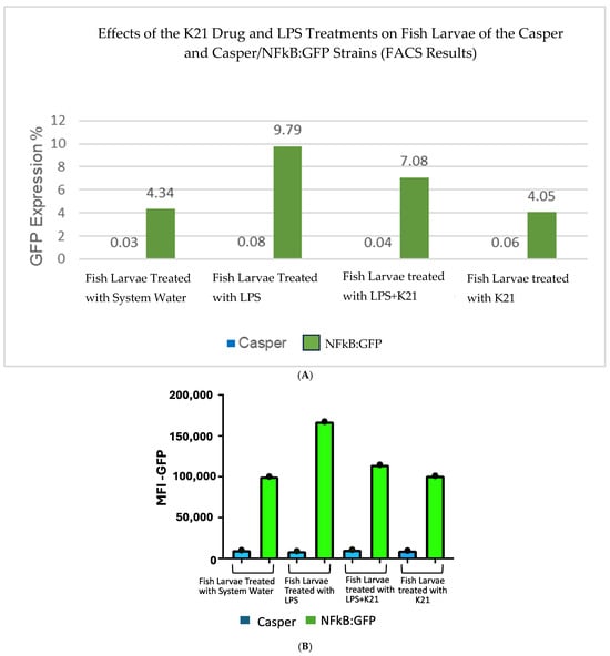 (A). Bar chart presenting GFP expression in Casper Tg(NF-κB:GFP) zebrafish larvae under different treatment conditions.Fluorescence-activated cell sorting (FACS) analysis of GFP expression in the zebrafish larvae following different treatments. The LPS-treated group shows the highest GFP expression (9.79%), confirming a significant inflammatory response. The LPS + K21 co-treatment group exhibits a reduction in GFP expression (7.08%), indicating the anti-inflammatory effect of K21. The K21-only treatment group (4.05%) shows GFP levels comparable to the control group (4.34%), demonstrating that K21 does not induce inflammation on its own. These results support the role of K21 as a modulator of inflammation, effectively reducing LPS-induced NF-κB activation in zebrafish larvae. (B). Bar chart presenting the AFI of GFP expression in Casper Tg(NF-κB:GFP) zebrafish larvae along with corresponding non-transgenic control Casper zebrafish larvae under different treatment conditions. Fluorescence-activated cell sorting (FACS) analysis of GFP expression in the zebrafish larvae following different treatments. Blue bar show the Casper line and green bars show GFP expression.