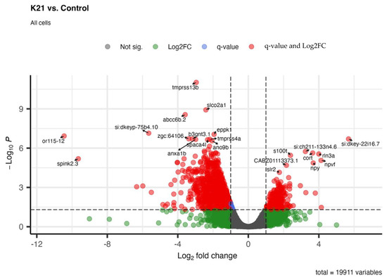 Whole-organism transcriptomic analysis of K21-treated vs. control zebrafish larvae. Volcano plot displaying differentially expressed genes (DEGs) in K21-treated zebrafish larvae compared to controls. Each point represents a gene, plotted based as the log2 fold change (x-axis) and statistical significance (−log₁₀ p-value, y-axis). Genes that were significantly upregulated (red) and downregulated (green) are highlighted, while non-significant changes appear in gray.