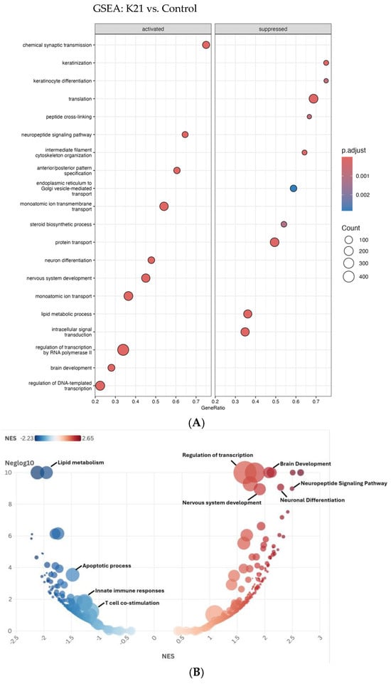 The bubble plot (Figure 10B) further refines and visually confirms the GSEA results obtained from the dot plot analysis, emphasizing pathways enriched by the K21 treatment through the distribution of normalized enrichment scores (NESs). Pathways activated by K21 (depicted in red) demonstrate significant enrichment for biological processes related to neuronal and brain development. The most prominently activated pathways included “brain development”, “neuronal differentiation”, “neuropeptide signaling pathway”, and “nervous system development”, all showing notably high NESs and statistical significance. These findings strongly support the hypothesis that K21 positively influences neuronal growth and functional maturation, potentially via enhancing synaptic communication and neuronal differentiation processes.