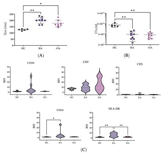 However, patients showed lower EVs concentration, OA 0.7 × 109 (0.4 × 109–1.1 × 109 particles/mL) and RA 0.8 × 109 (0.4 × 109–1.2 × 109 particles/mL), in comparison to HCs 6.5 × 109 (0.3 × 109–1.5 × 109 particles/mL) (p < 0.05, both comparisons) (Figure 1B).