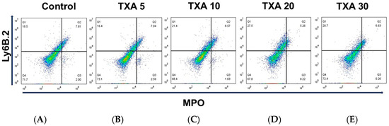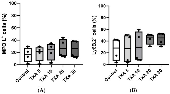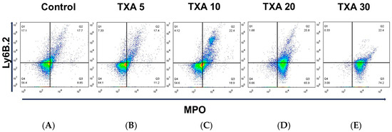 The expressions of circulating anti-MPO antibody and anti-Ly6B.2 antibody were analyzed across the Control, TXA 5, TXA 10, TXA 20, and TXA 30 groups using flow cytometry (Figure 3). There was no significant difference in anti-MPO antibody expression between the Control group and the TXA 5 or TXA 10 groups. However, expression levels were significantly elevated in both the TXA 20 and TXA 30 groups compared to the Control group (90.9 (1.9)% vs. 14.7 (3.4)%, p = 0.001; 96.0 (7.1)% vs. 14.7 (3.4)%, p = 0.001, respectively) (Figure 4A). The expression of anti-Ly6B.2 antibody, a neutrophil marker, was comparable across all groups, with no statistically significant differences observed (Figure 4B).