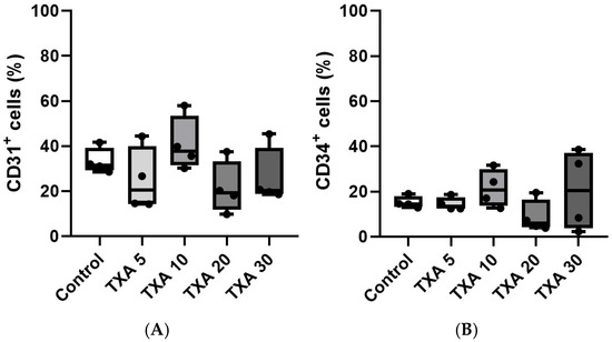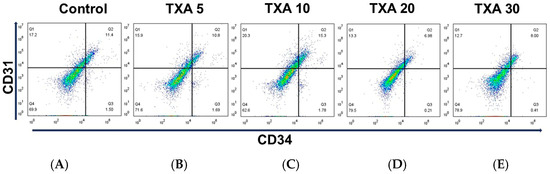 The expressions of localized anti-CD31 and CD34 antibodies in the thrombotic femoral artery were assessed in the Control, TXA 5, TXA 10, TXA 20, and TXA 30 groups using flow cytometry (Figure 7). There were no significant differences in the expression of CD31 or CD34 among the groups (Figure 8A,B).