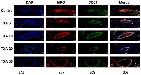 The expressions of localized anti-MPO antibody (NET marker) and anti-CD31 antibody (platelet marker) in the thrombotic femoral artery were analyzed across the Control, TXA 5, TXA 10, TXA 20, and TXA 30 groups using immunohistofluorescence staining (Figure 9). There were no significant differences in the expression of either anti-MPO or anti-CD31 antibody among the groups (Figure 10A,B).