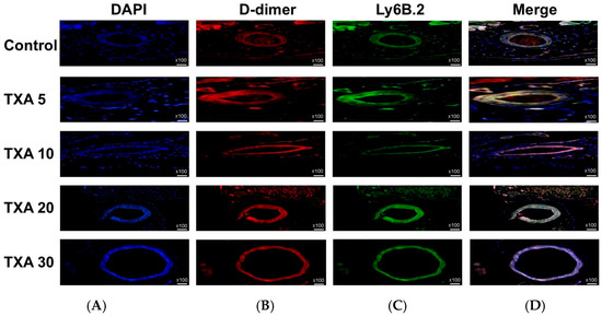Immunofluorescence staining of localized D-dimer and neutrophils in thrombotic femoral artery. Immunofluorescence staining was performed to evaluate the expression of D-dimer polyclonal antibody (thrombus marker) and anti-Ly6B.2 antibody (neutrophil marker) in thrombotic femoral artery tissues from the Control, TXA 5, TXA 10, TXA 20, and TXA 30 groups. (A) DAPI staining showing nuclear localization in each group. (B) Immunostaining of D-dimer polyclonal antibody in each group. (C) Immunostaining of anti-Ly6B.2 antibody in each group. (D) Merged images showing the co-localization of thrombus and neutrophils based on D-dimer and Ly6B.2 staining. Abbreviations: TXA, tranexamic acid; DAPI, 4′,6-diamidino-2-phenylindole.