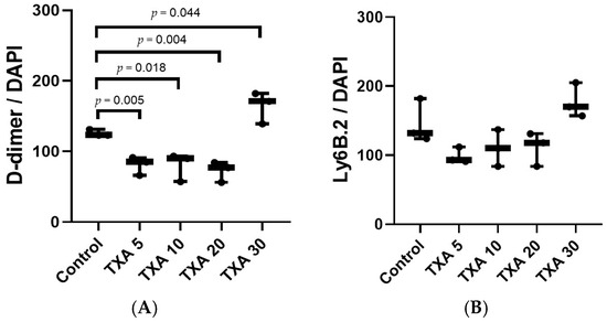 The expressions of localized D-dimer and anti-Ly6B.2 antibody in the thrombotic femoral artery were analyzed across the Control, TXA 5, TXA 10, TXA 20, and TXA 30 groups using immunohistofluorescence staining (Figure 11). D-dimer expression was significantly reduced in the TXA 5, TXA 10, and TXA 20 groups compared to the Control group (85.0 (12.5)% vs. 123.0 (4.0)%, p = 0.005; 90.0 (18.0)% vs. 123.0 (4.0)%, p = 0.018; 77.0 (14.0)% vs. 123.0 (4.0)%, p = 0.004, respectively) (Figure 12A). On the other hand, D-dimer expression was significantly increased in the TXA 30 group compared to the Control group (171.0 (21.5)% vs. 123.0 (4.0)%, p = 0.044) (Figure 12A). The expression of localized anti-Ly6B.2 antibody was comparable across all groups (Figure 12B).