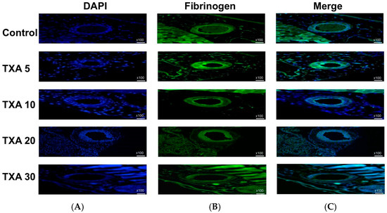 Immunofluorescence staining of localized fibrinogen in thrombotic femoral artery. Immunofluorescence staining was performed to assess the expression of fibrinogen in thrombotic femoral artery tissues from the Control, TXA 5, TXA 10, TXA 20, and TXA 30 groups. (A) DAPI staining showing nuclear localization in each group. (B) Immunostaining of fibrinogen antibody in each group. (C) Merged images showing the co-localization of DAPI and fibrinogen staining in each group. Abbreviations: TXA, tranexamic acid; DAPI, 4′,6-diamidino-2-phenylindole.