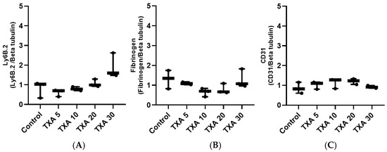 The expressions of anti-Ly6B.2 antibody, fibrinogen α-chain, and anti-CD31 antibody in thrombotic femoral artery tissues were evaluated by Western blot analysis across the Control, TXA 5, TXA 10, TXA 20, and TXA 30 groups (Figure 15). Anti-Ly6B.2 antibody expression exhibited an increasing trend with higher TXA doses. However, the differences were not statistically significant (Figure 16A). The expression levels of fibrinogen α-chain and anti-CD31 antibody were comparable across all groups (Figure 16B,C).