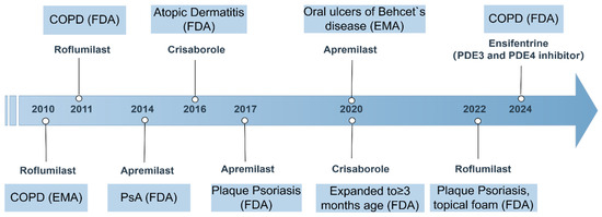 Timeline of PDE4 inhibitor approvals and key indications (2010–2024). This figure summarizes the regulatory approval timeline and major indications for marketed PDE4 inhibitors. COPD, chronic obstructive pulmonary disease; FDA, U.S. Food and Drug Administration; EMA, European Medicines Agency; PsA, psoriatic arthritis.