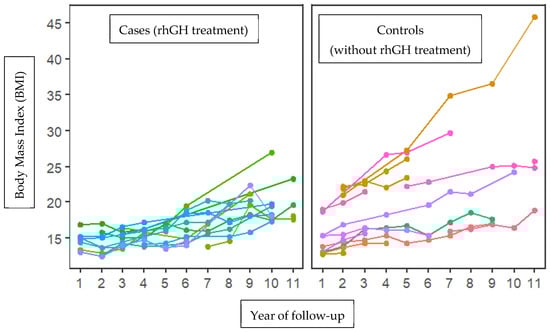 Increasing trend in body mass index (BMI) between cases (growth hormone treatment) and controls (without treatment with growth hormone) during 11 years of follow-up. A tendency towards increased BMI is observed in patients not treated with the growth hormone, with significant differences in times (2, 3, and 4). Each color corresponds to a patient’s follow-up for 10 years.