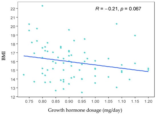 Subsequently, the correlation between BMI and the dose of growth hormone used to treat the cases was evaluated. A tendency towards a negative correlation between BMI and the dose of growth hormone was observed: as the dose of growth hormone increases, the BMI decreases (R = −0.21). However, this correlation is not statistically significant (p = 0.067) (Figure 2).