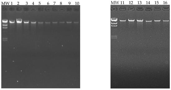 Sixteen blood samples from patients (eight cases and eight controls) were chosen for the DNA extraction process. The quality of the samples was assessed using a 1.5% agarose gel, and it was found that all 16 samples had good genetic material integrity, and no degradation was observed (Figure 3).