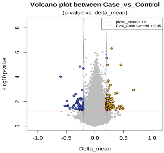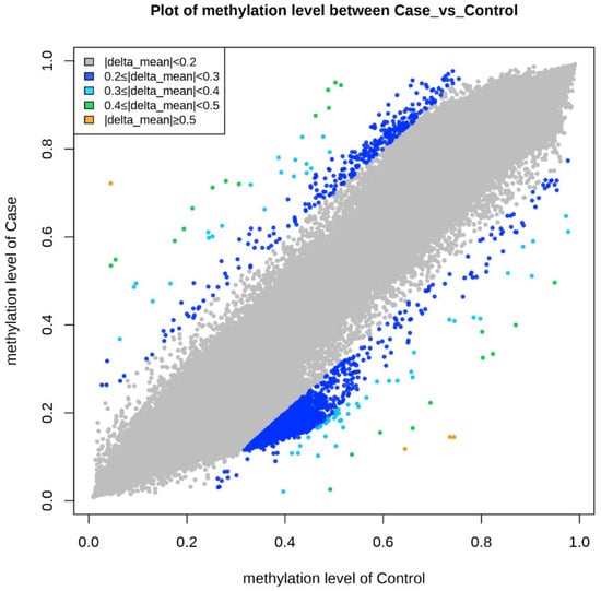 The graph shows the comparison of methylation levels between cases and controls. Each point on the graph represents a methylated region of the genome. The gray color represents delta mean values (<0.2) or methylated regions without differences in methylation levels, dark blue points are methylated regions with delta mean values (<0.3), light blue points are methylated regions with delta mean values (<0.4), green points are methylated regions with delta mean values (<0.5), and orange points are methylated regions with delta mean values (greater than or equal to 0.5).