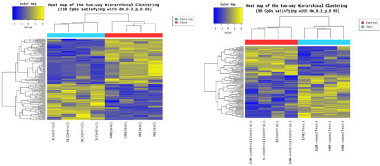 Heat map between the analyzed patients and the 138 differentially methylated CpG regions. The figure shows on the Y-axis the 138 CpG regions with statistically significant differences in the methylation level (delta-mean: 0.2, and p = 0.05). The analyzed patients, controls (blue rectangle), and cases (red rectangle) are shown on the X-axis. In the central part of the heat map, the number of times the methylation level increases or decreases is shown, with a decrease between (−2 and 0) (blue color) and an increase between (0 and +2) (yellow color).