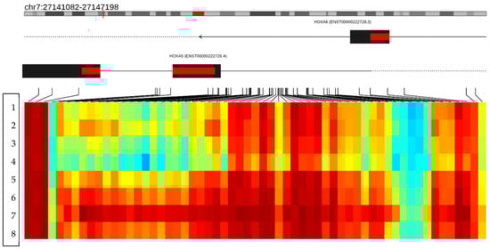 The figure shows a differentially methylated region located on the short arm of chromosome 7 (p15.2). The figure merges the neighboring CpGs that show a variation consistent with the hypermethylation status in the HOXA5 gene. The columns represent the CpG islands and the rows the patients analyzed. The first four rows show the methylation status of the HOXA5 gene in the controls, and rows 5–8 represent the methylation status of the HOXA5 gene in the cases. The heat map represents the methylation status of the CpG regions of the HOXA5 gene; the red color represents the hypermethylated regions, and the blue color the hypomethylated regions, evidencing a hypermethylation state in the HOXA5 gene in the cases. Red color indicates hypermethylated regions and light colors indicate hypomethylated regions.