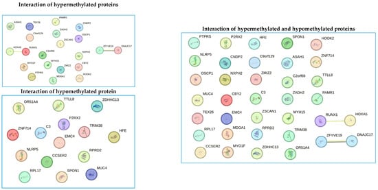 Protein interaction analysis revealed interactions between proteins encoded by genes (RUNX1 and HOXA5), and (ZFYVE19 and DNAJC17). Both interactions correspond to proteins that are in the group of hypermethylated proteins. These interactions indicate a synergy between proteins and are related to a hypermethylation genotype. On the other hand, interactions between hypomethylated proteins could not be predicted. Additionally, when predicting interactions between the groups of hypermethylated and hypomethylated proteins, no interaction between them could be predicted, and the two interactions between hypermethylated proteins were maintained (Figure 8).