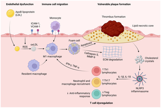 Endothelial dysfunction promotes the infiltration of ApoB-containing lipoproteins (LDLs) into the arterial wall, where they undergo oxidative modification (oxLDL) via reactive oxygen species (ROS). OxLDL triggers the recruitment of monocytes through the upregulation of adhesion molecules (ICAM-1, VCAM-1). Monocytes differentiate into resident and M1 macrophages, which engulf oxidized LDL (oxLDL) to form foam cells. Pro-inflammatory cytokines (IFN-γ, TNF-α) secreted by Th1 lymphocytes further activate M1 macrophages, amplifying inflammation. Foam cell apoptosis and the secretion of proteases such as cathepsin S and MMP-9 contribute to extracellular matrix (ECM) degradation, the thinning of the fibrous cap, and the expansion of the lipid necrotic core. Cholesterol crystals released from dying foam cells activate the NLRP3 inflammasome, leading to increased secretion of IL-1β and IL-18, which further recruit inflammatory cells and perpetuate vascular inflammation. The dysregulation of T cell subsets-characterized by increased Th1 and Th17 lymphocytes and decreased regulatory T cells (Tregs) exacerbates inflammation, disrupts anti-inflammatory responses, and promotes plaque instability and thrombus formation. Created in BioRender. Tirziu, A. (2025) https://BioRender.com/lcalh3v (accessed on 20 May 2025).
