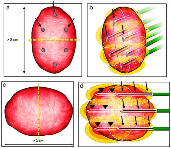 Ablation technique for lesions larger than 3 cm. The craniocaudal size is the dominant dimension (larger than 3); we bisect the tumor at its center (yellow dash line) and strategize the ablation as though handling two distinct tumors (a). Initially, we address the cranial part using 3 probes (black arrows), then reposition the 3 probes to target the more inferior part (b). If the tumor’s width (transverse dimension) is the greater dimension, we again divide the lesion at its center (yellow dash line) (c). First, we position the 3 probes (arrow heads) to address the deeper portion of the tumor and subsequently retract the probes (black arrows) to treat the superficial portion of the tumor (d).