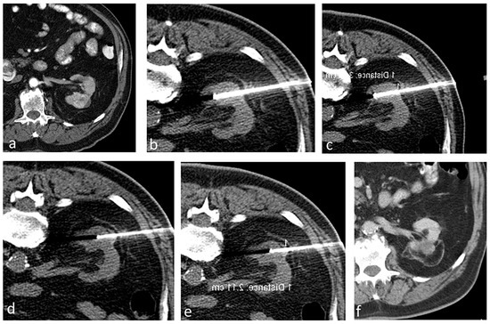 A patient with a 3.9 cm biopsy-proven RCC treated using RFA. (a) Contrast-enhanced CT showing a renal mass (3.9 cm in transverse diameter) in the left kidney. (b–e) Ablation procedure. (b,c) Non-contrast axial CT showing the probes positioned to treat the deeper portion of the tumor, and subsequently the probes were retracted to treat the superficial portion of the tumor (d,e). (f) Contrast-enhanced CT after 5 years showing no evidence of residual or recurrent tumor in the left kidney.