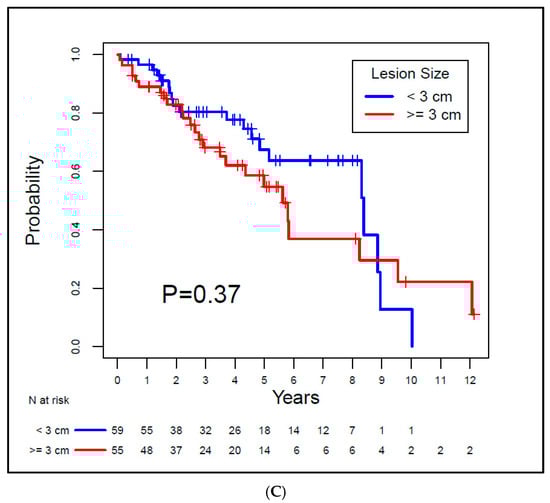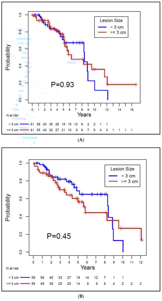 However, our oncological and survival outcomes differ from those reported by Johnson et al. [22]. When they categorized tumors based on size (under 3 cm versus 3 cm or larger), a significant difference was evident in recurrence and survival rates. The authors reported a significant decline in the 6-year OS from 97% to 68% for lesions 3 cm or larger. Similarly, a significant decrease was seen in both LRFS and DFS [22].